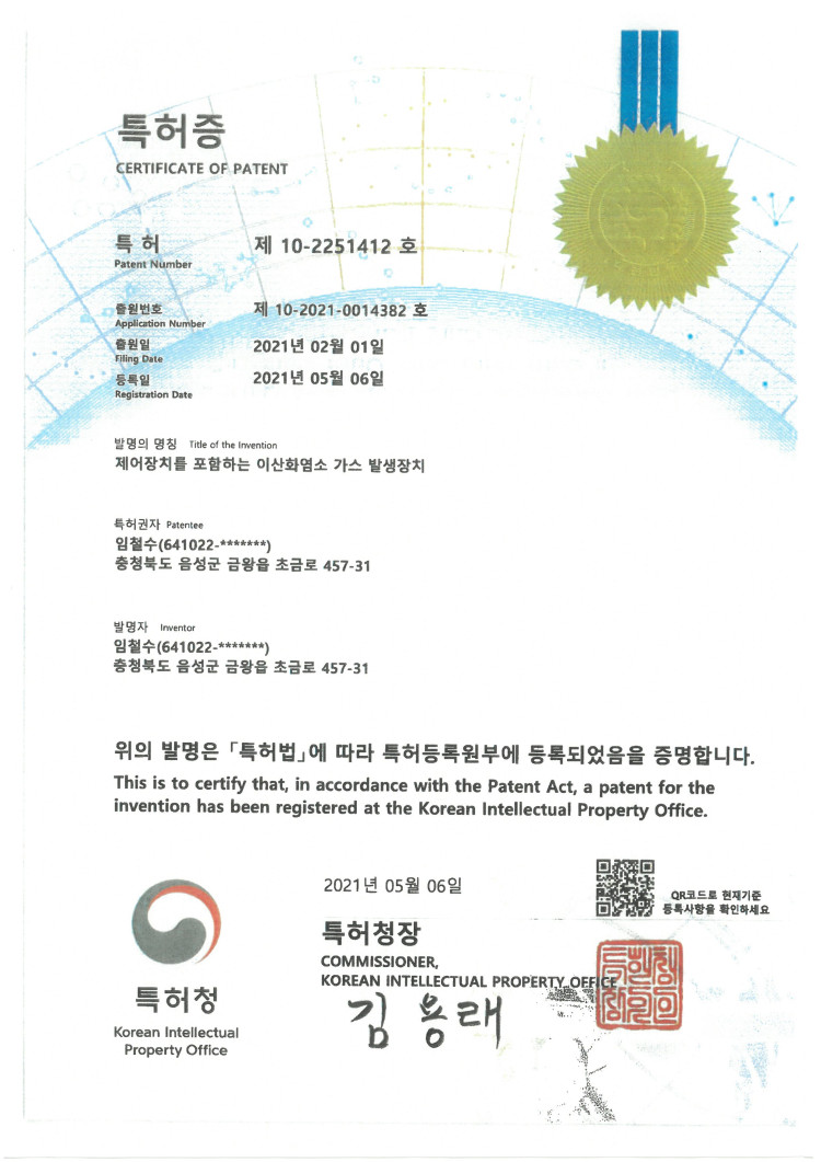 특허증(제어장치를 포함하는 이산화염소 가스 발생장치) 페이지 정보 작성자 관리자 작성일25-12-18 11:44 댓글0건 관련링크 이전글 다음글 목록 본문 제어장치를 포함하는 이산화염소 가스 발생장치 댓글목록 등록된 댓글이 없습니다. 이전글 다음글 목록